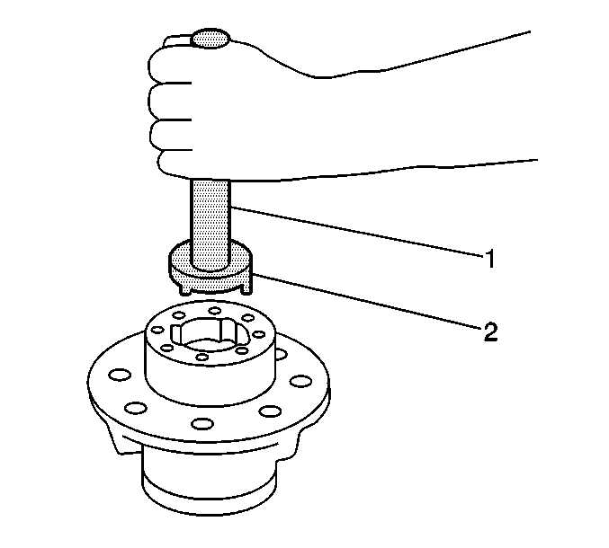 11. Turn the wheel hub over and seat the outer bearing assembly against the retaining ring using the J 24426  (2) and the J 8092  (1).