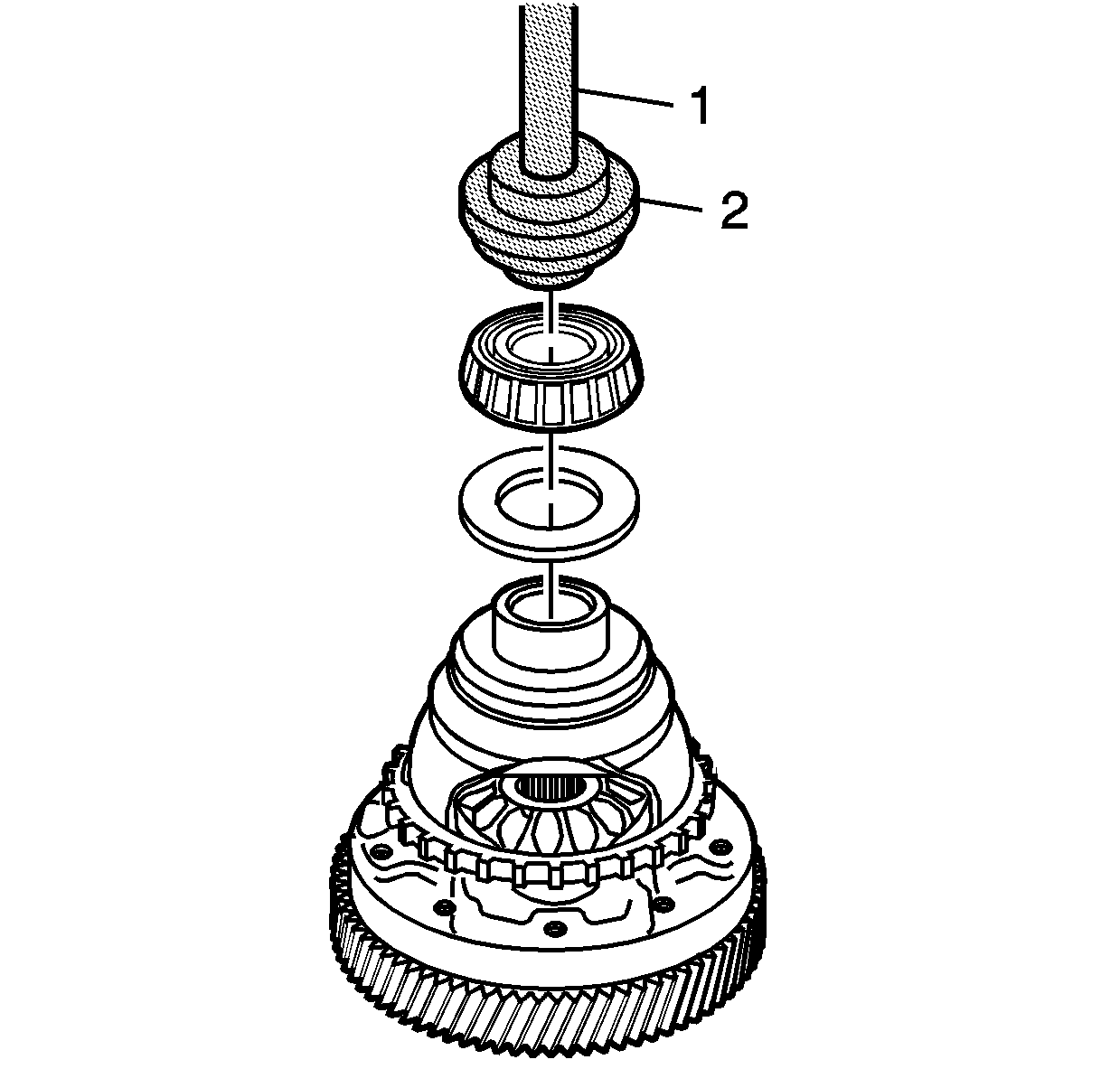 15. Install a NEW right differential side bearing and shim onto the differential case using the J 44386  (2) and the J 7079-2  (1).