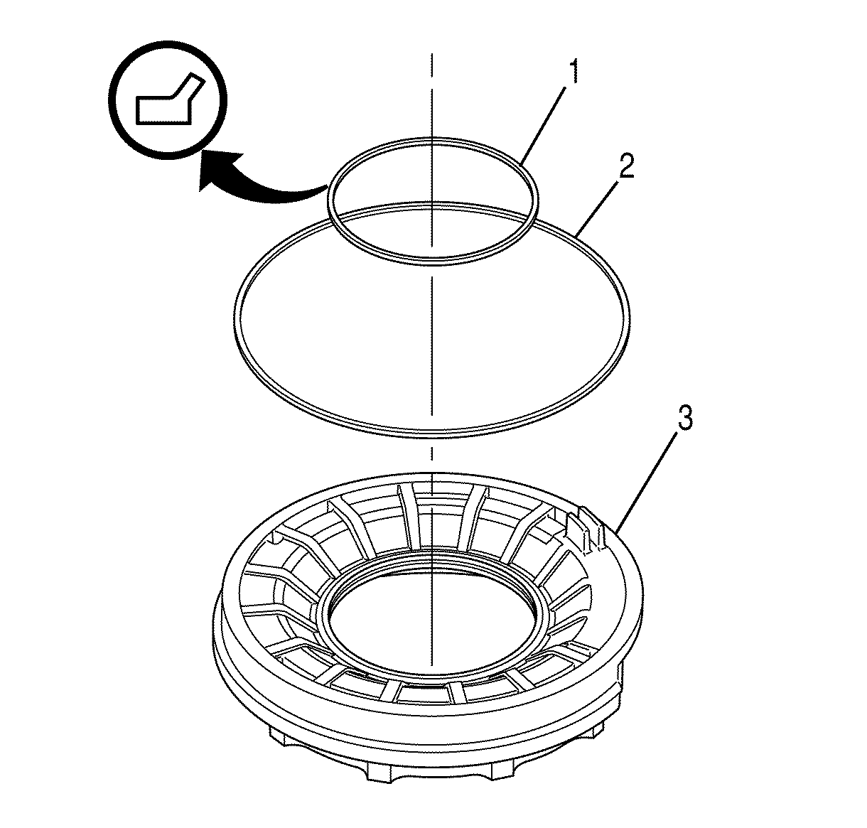 8. Install seal ring (1) and seal ring (2) onto the low and reverse clutch piston (3). Lubricate the seal rings with J 36850 or an equivalent lubricant.